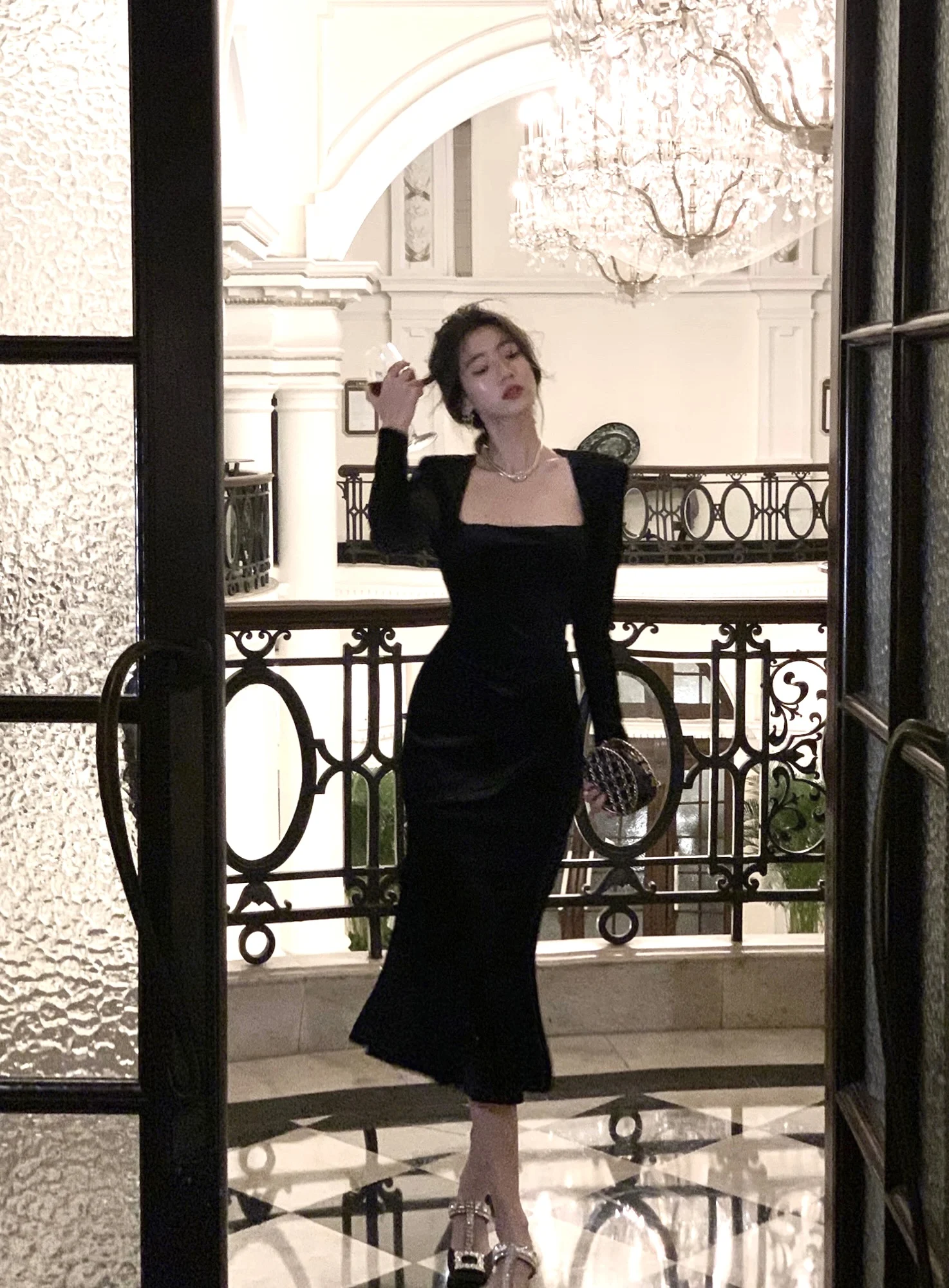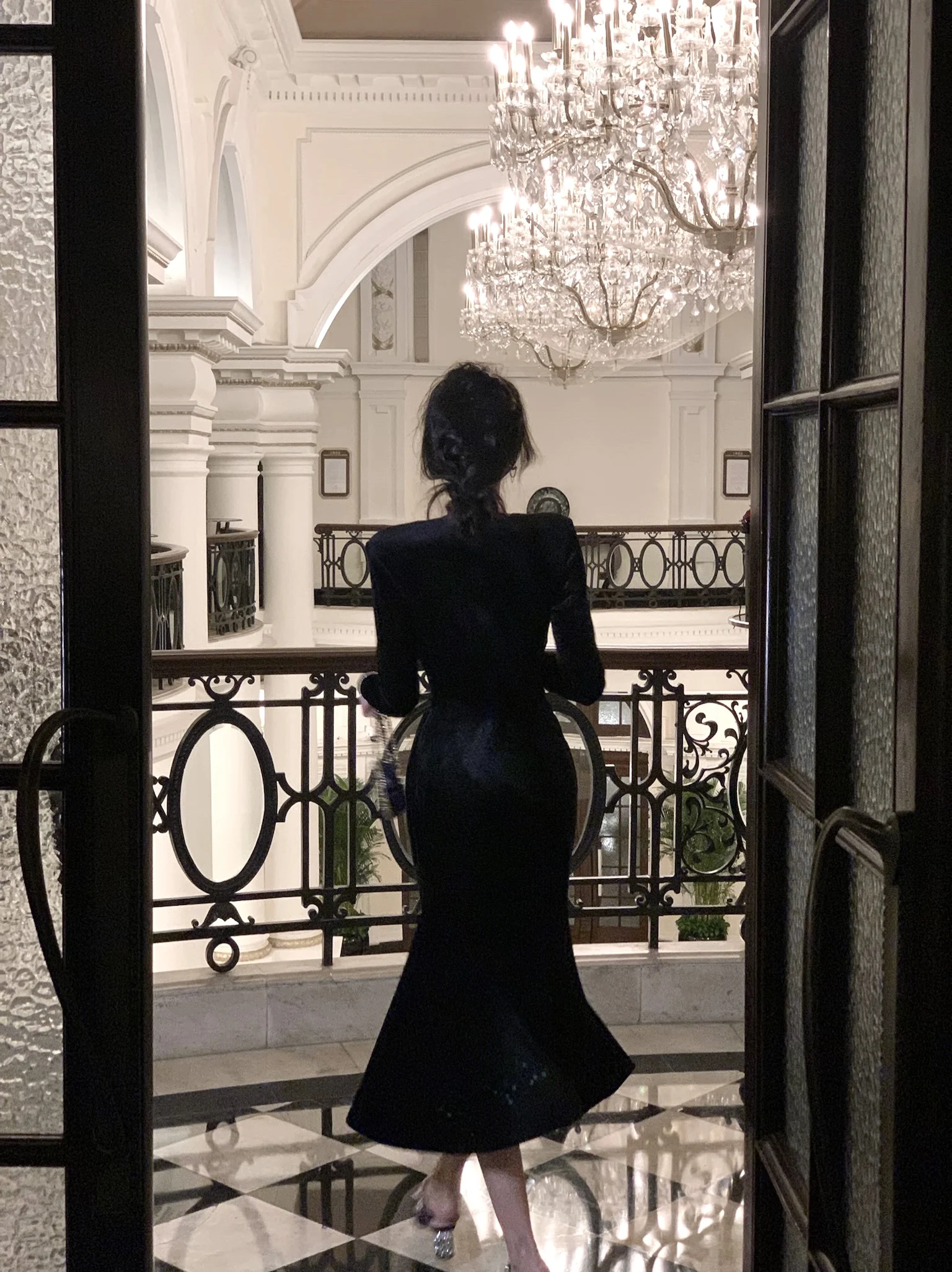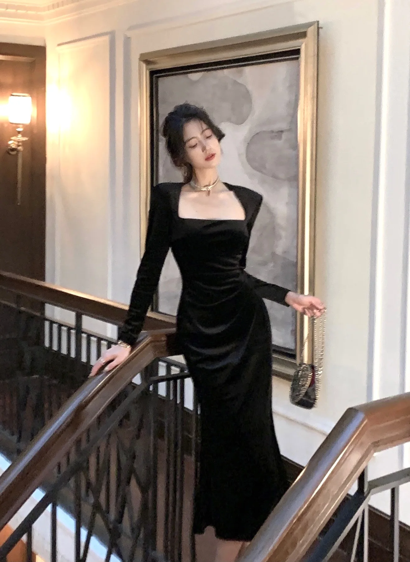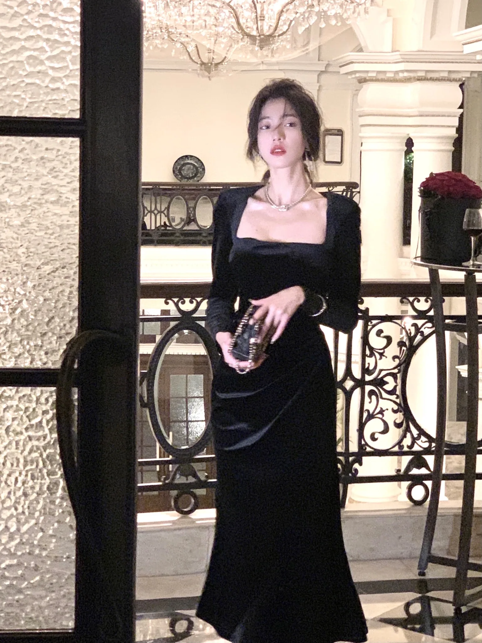 Spring New Women Elegant Long Black Velvet Dress Sexy Prom Evening Party Birthday Club Fashion One Piece Clothing