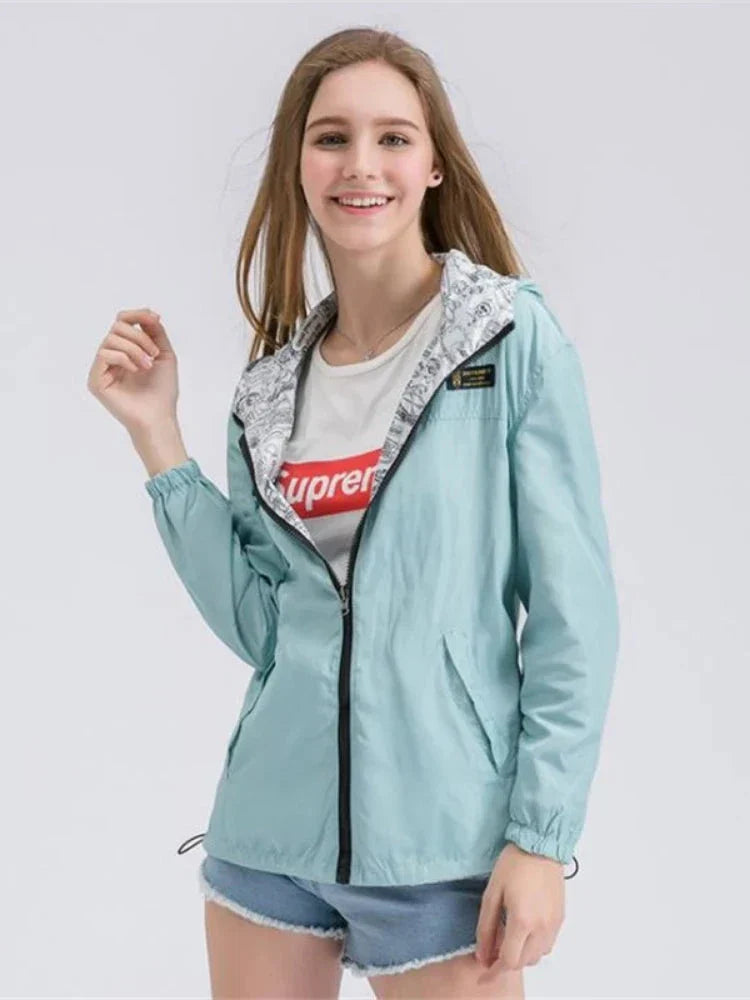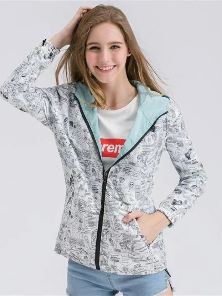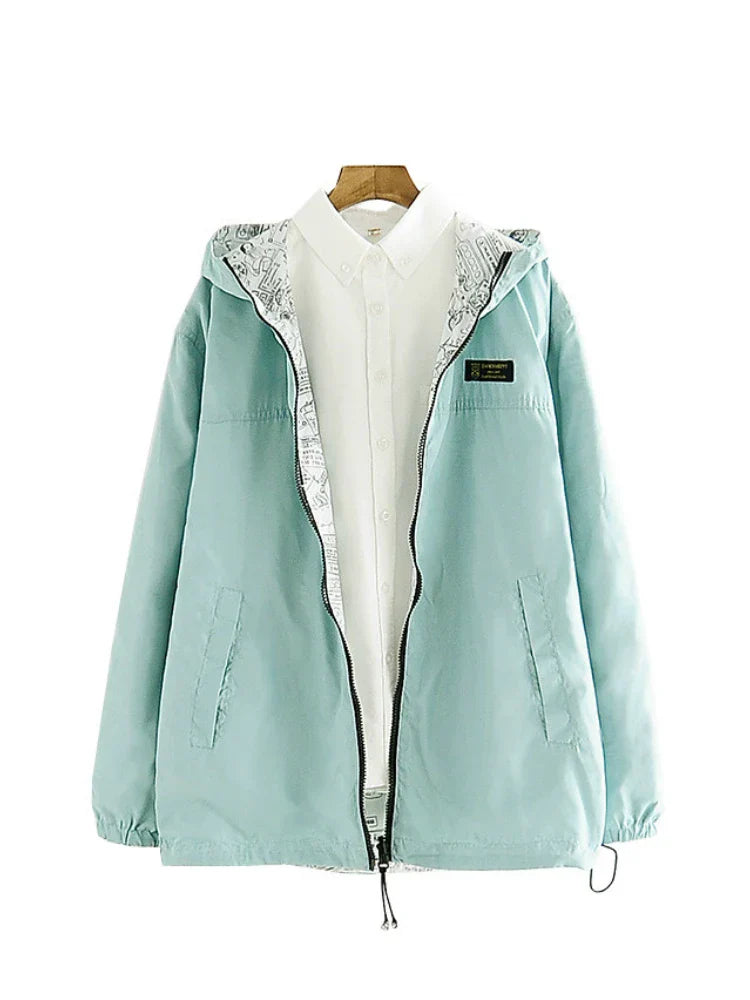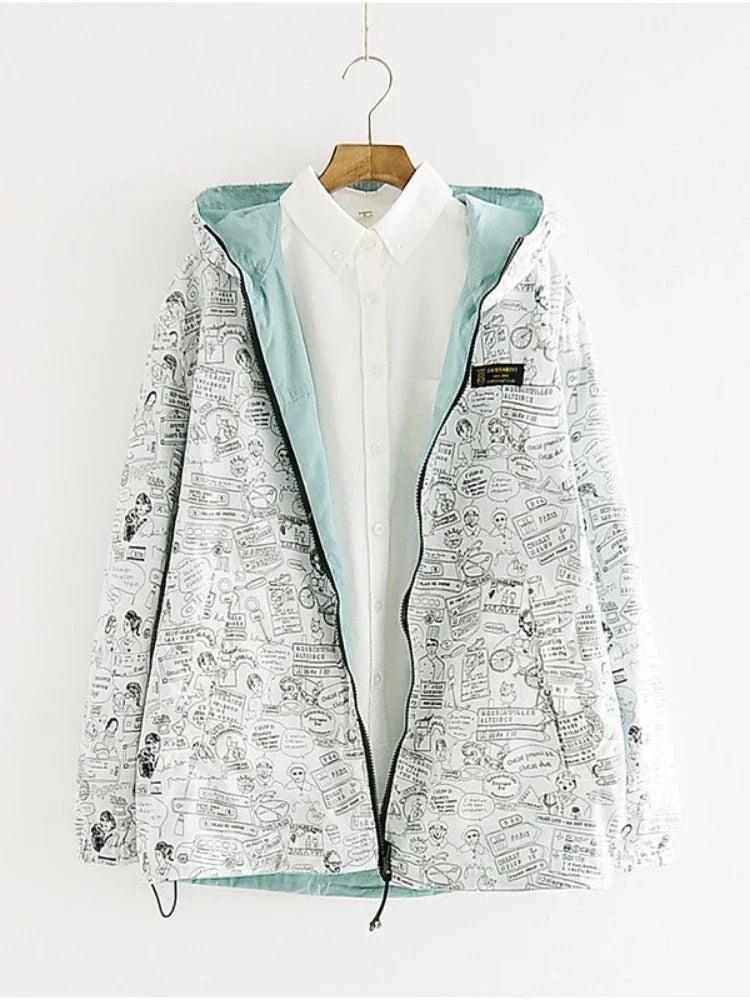 Spring Women Bomber Basic Jacket Pocket Zipper Hooded Two Side Wear Cartoon Print Outwear Loose Coat