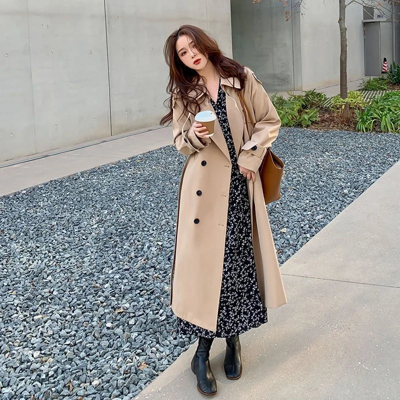 Streetwear Loose Trench Coat Midi Length Fashion Korean Elegant Khaki Black Women's Windbreaker Coat Casual Double Breasted Tops