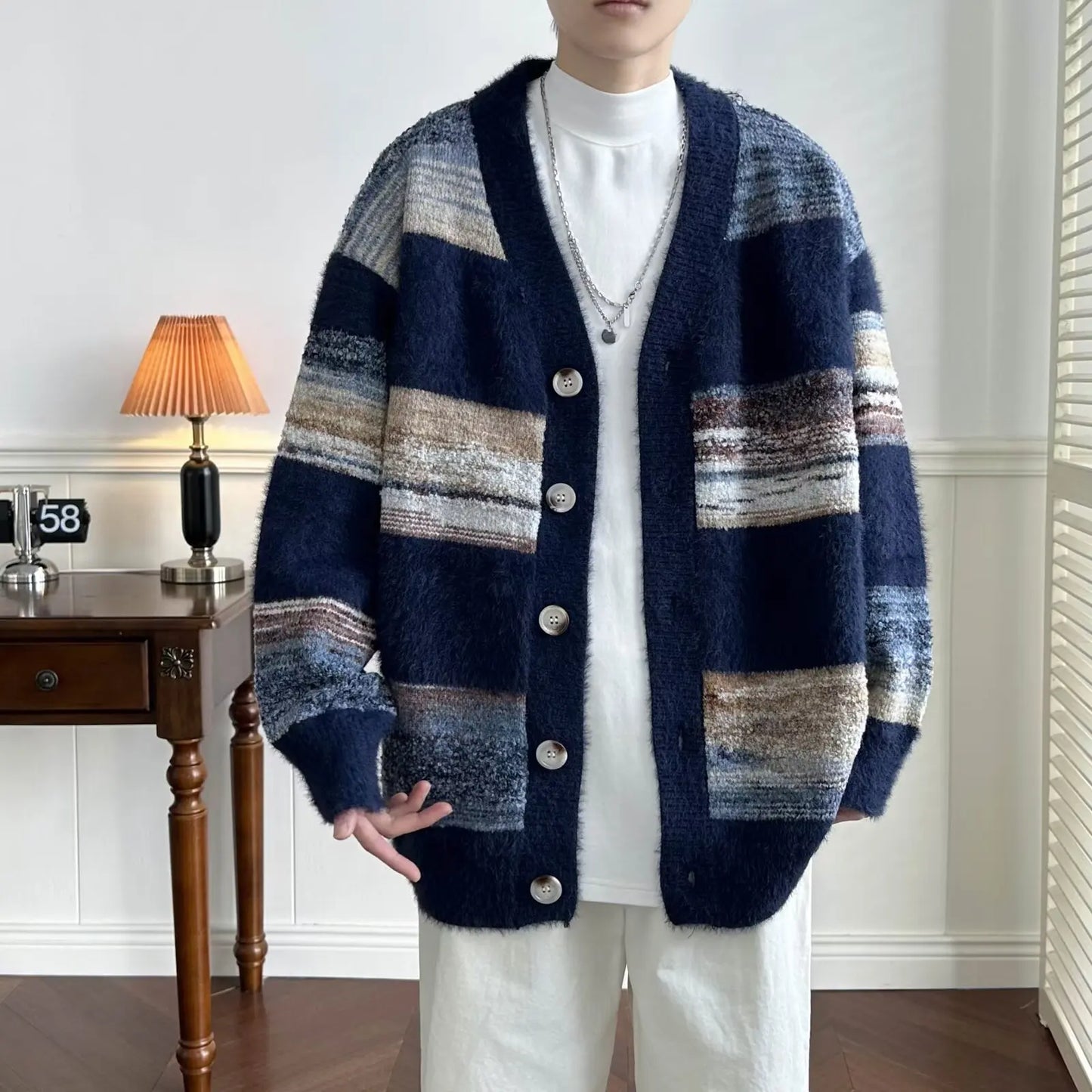 maoxiangshop Striped Cardigan Men Chic Baggy Slouchy V-neck Japanese Style Harajuku Vintage High Street Knitting Sweaters All-match Autumn