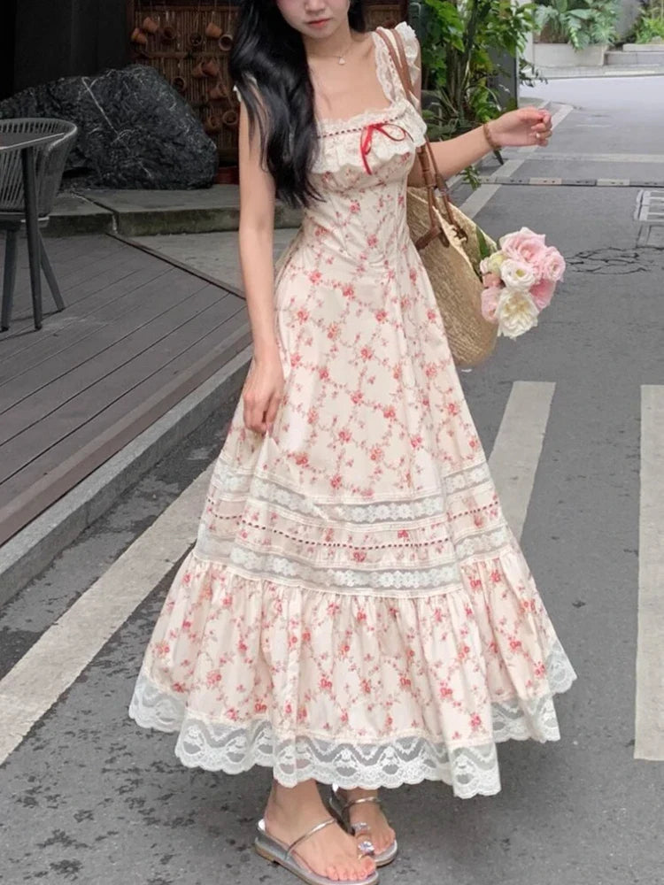 Summer French Elegant Floral Midi Dress Beach Style Korean Fashion Lace Dress Evening Party Sexy Sleeveless Dress Woman Chic