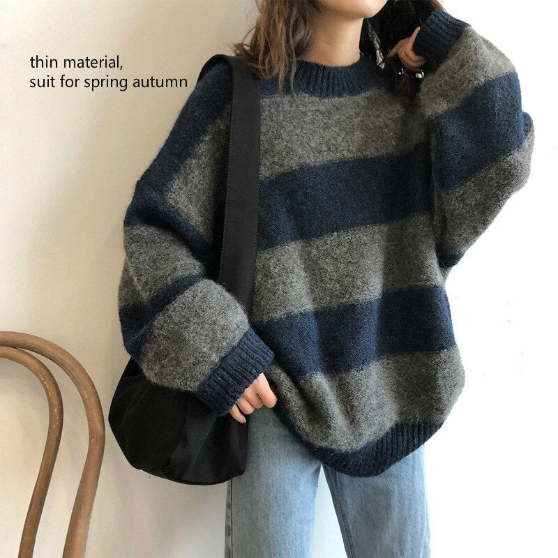 Thin Oversized Sweater Women Vintage Loose Pullover Casual Striped Sweaters Knitted Jumper Fashion Streetwear Sueter Mujer