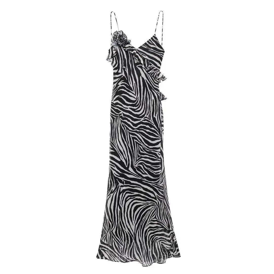 Sexy Women 3D Flower Strap Long Dress New Summer V-neck Sleeveless Ruffles Striped Dress Elegant Ladies Beach Party Dress