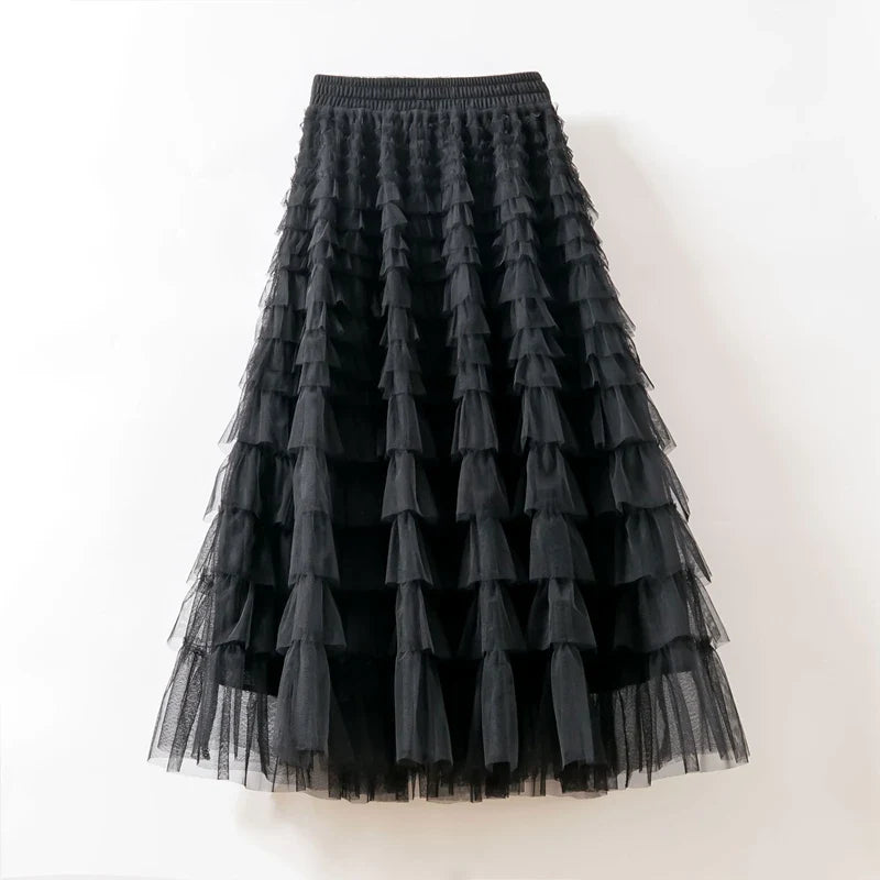maoxiangshop Tutu Cake Skirts Women Elegant Cascading Ruffles A Line Long Skirts Female Casual Elastic Waist Party Skirt Black Skirt