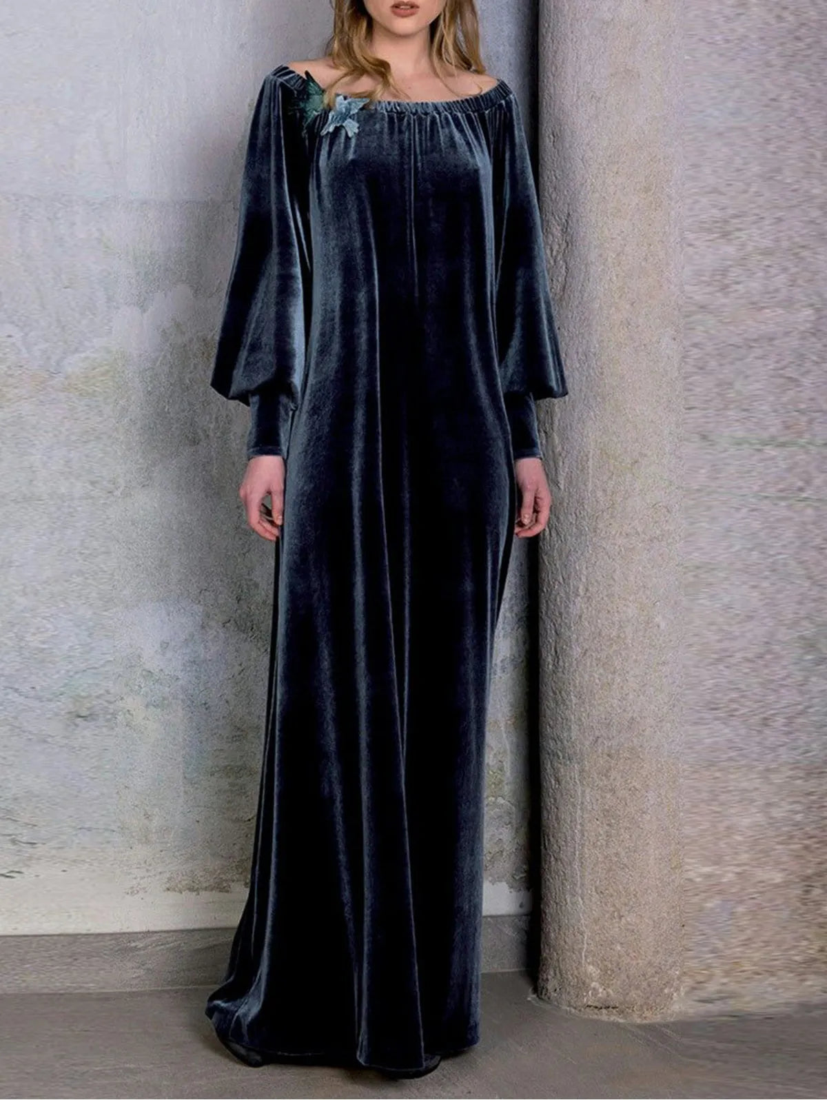 maoxiangshop Velvet Vintage Women Maxi Dress Oversize Boat Neck Lantern Long Sleeves Evening Dress Slim Fit Pleated Bodycon Prom Dress