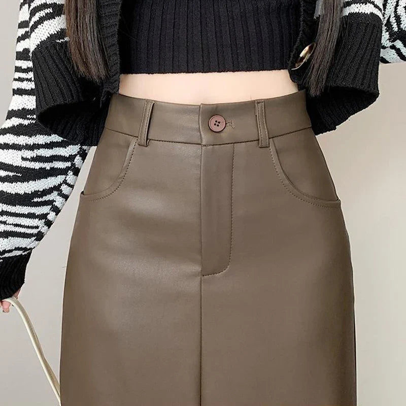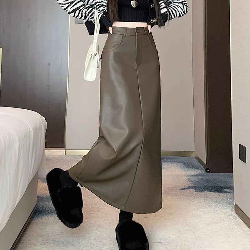 maoxiangshop Vintage Coffee Black Long Skirt for Women Casual Back Split Pu Leather Skirts Ladies Autumn Winter High Waist A-Line Skirt