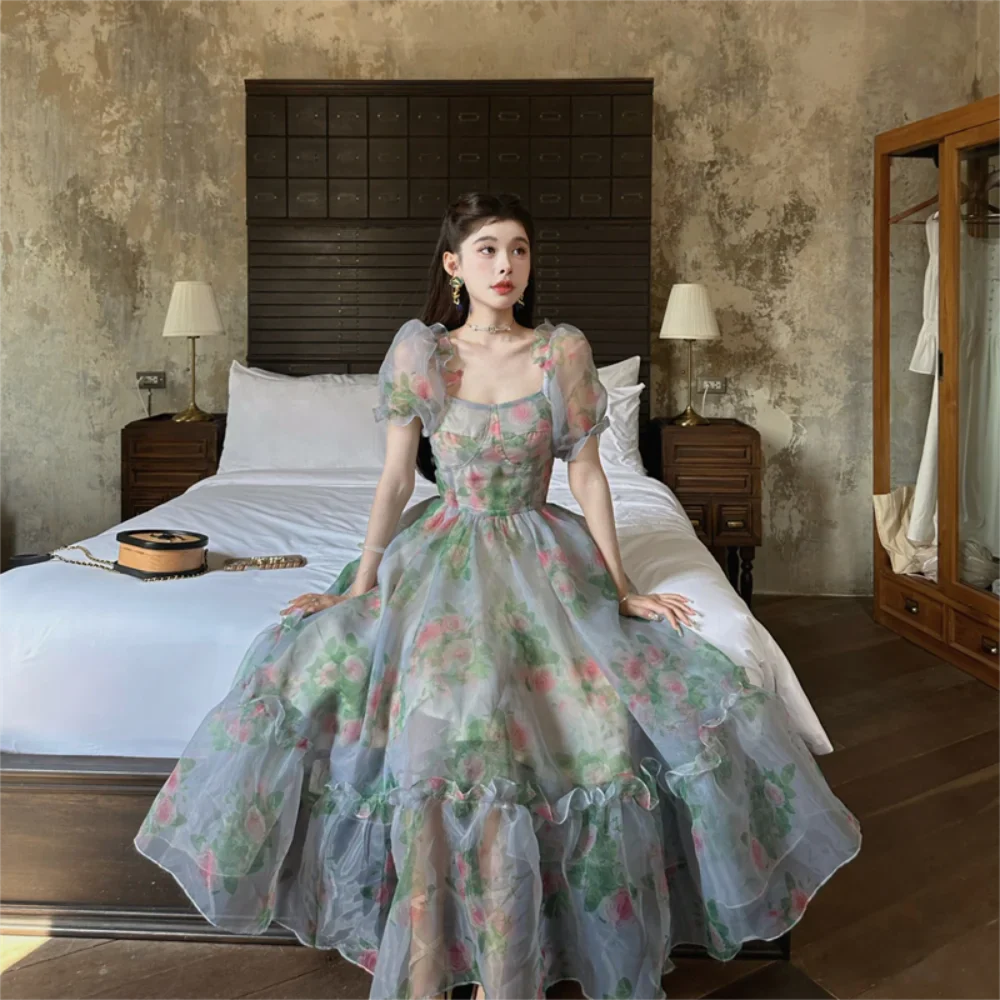 Vintage Floral Evening Midi Maxi Dresses for Women Elegant Casual Party Prom Green Holiday Princess Fairy Long Dress Summer 2024