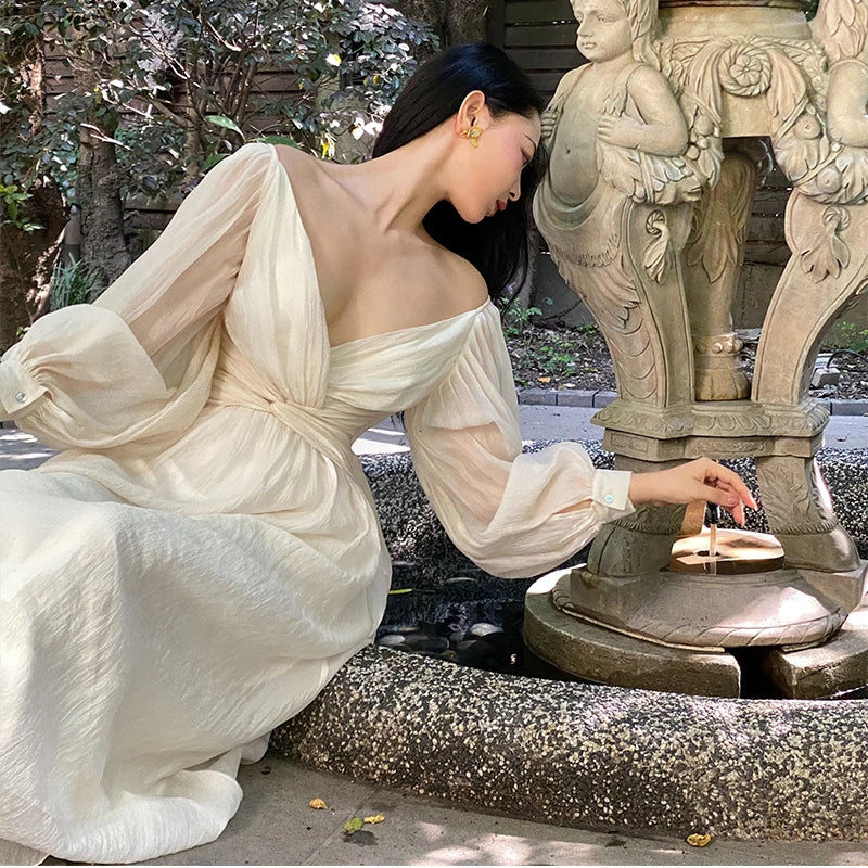 Vintage Korean V-neck Pleated Maxi Dresses for Women Ladies Party Fringed Lace Puff Sleeve Ruffled Lady Dreses Elegant Summer