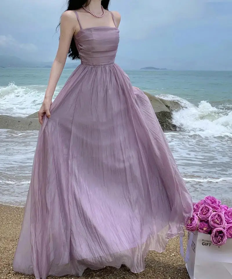 Vintage Spaghetti Strap Purple Long Dresses for Women Summer Sexy Tulle Pleats Fairy Evening Party Backless Female Clothing