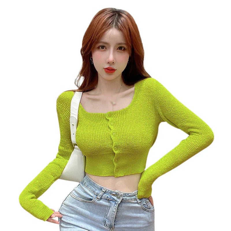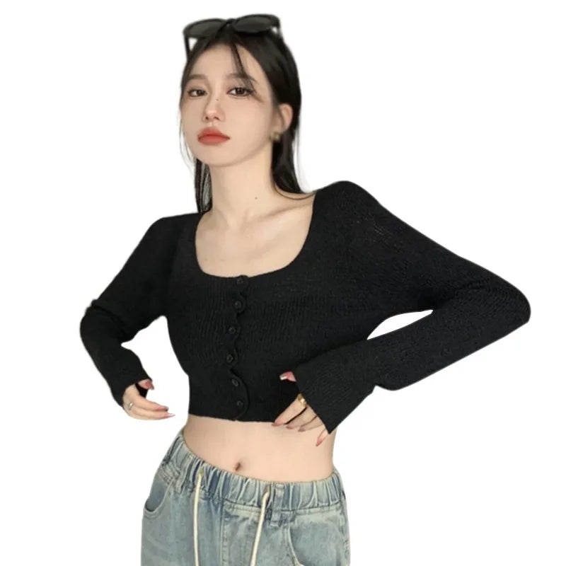 Women Autumn Long Sleeve Sweater Square Neck Slim Crop Top Female Winter Korean Solid Short Button Knitted Tops Chic Sweaters