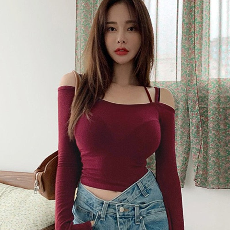 maoxiangshop Women Cropped Tee Shirts Lady Long Sleeve Halter Slash Neck Stretchy Crop Tops Girls Slim T Shirts