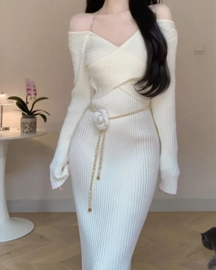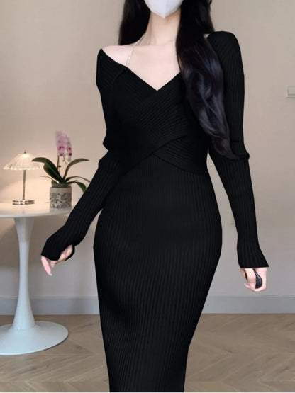Women Elegant Slim Knitting Midi Dress Autumn New Solid Ribbed Bodycon Evening Party Vestidos Winter Sweater Robe Jumper