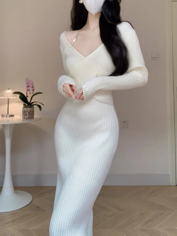 Women Elegant Slim Knitting Midi Dress Autumn New Solid Ribbed Bodycon Evening Party Vestidos Winter Sweater Robe Jumper