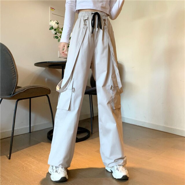 Women Fashion Harajuku Cargo Pants Black Detachable Strap Trousers Female Elastic Waist Streetwear Pants Plus Zise Casual Pants