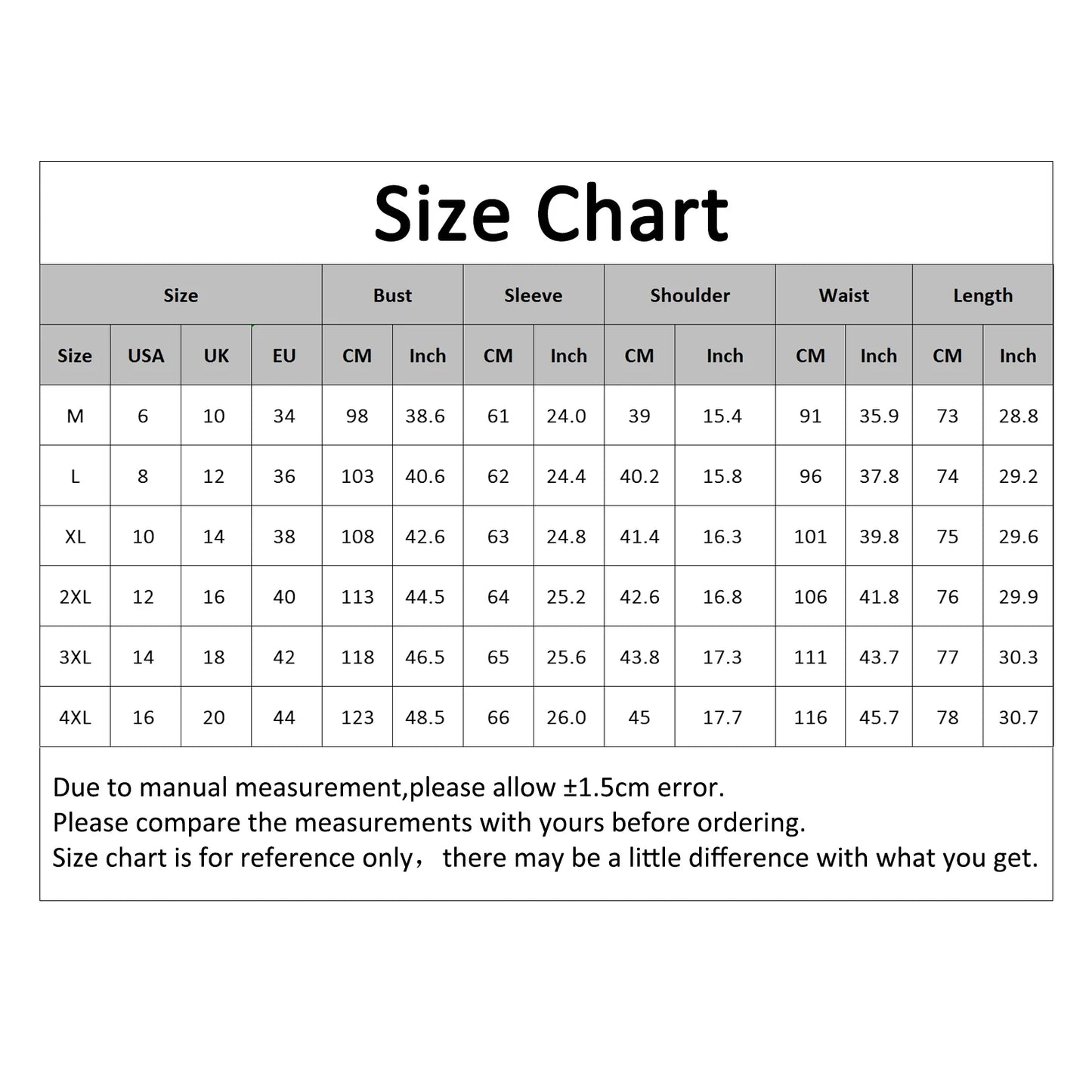 [Our Size 4XL] Bust: 123cm/48.4", Waist: 116cm/45.7", Shoulder: 45cm/17.7", Sleeve: 66cm/26", Length: 78cm/30.7" (Approx.)