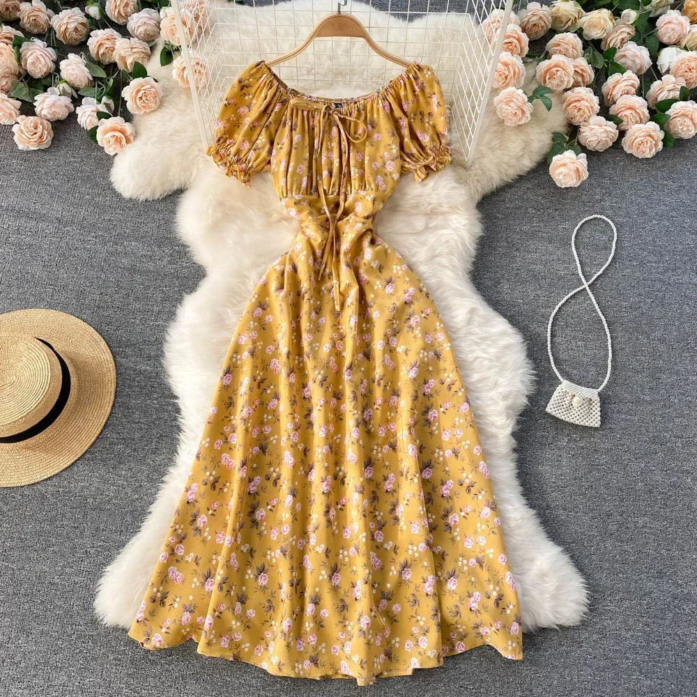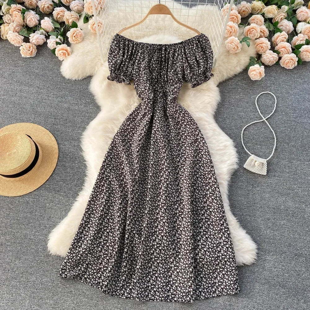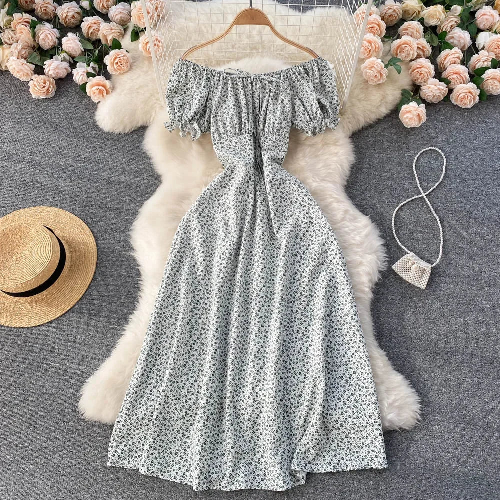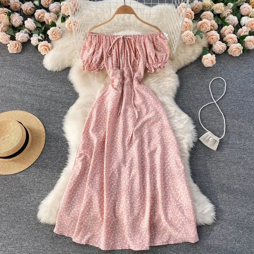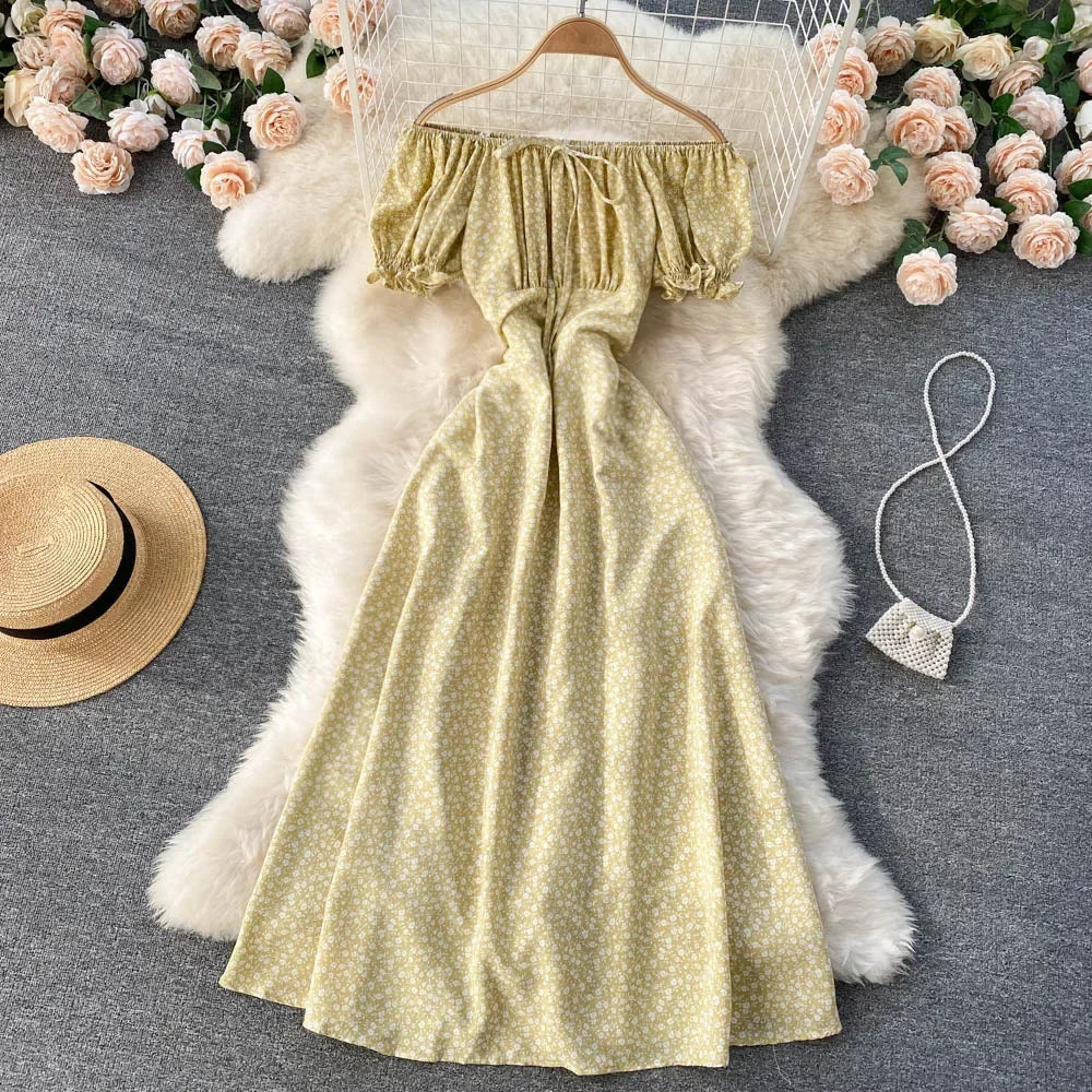 Women Floral Dress Bohemian A-Line Slash Neck Short Sleeves Dress Summer Vintage Beach off Shoulder Polka Dot Sundress