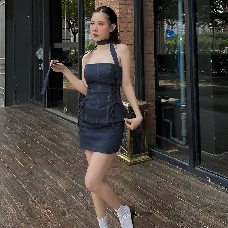 maoxiangshop Women Formal Occasions Two Piece Set Sexy Side Cross Bandage Solid Tube Tank Top With Skinny Slim Skirt Summer New