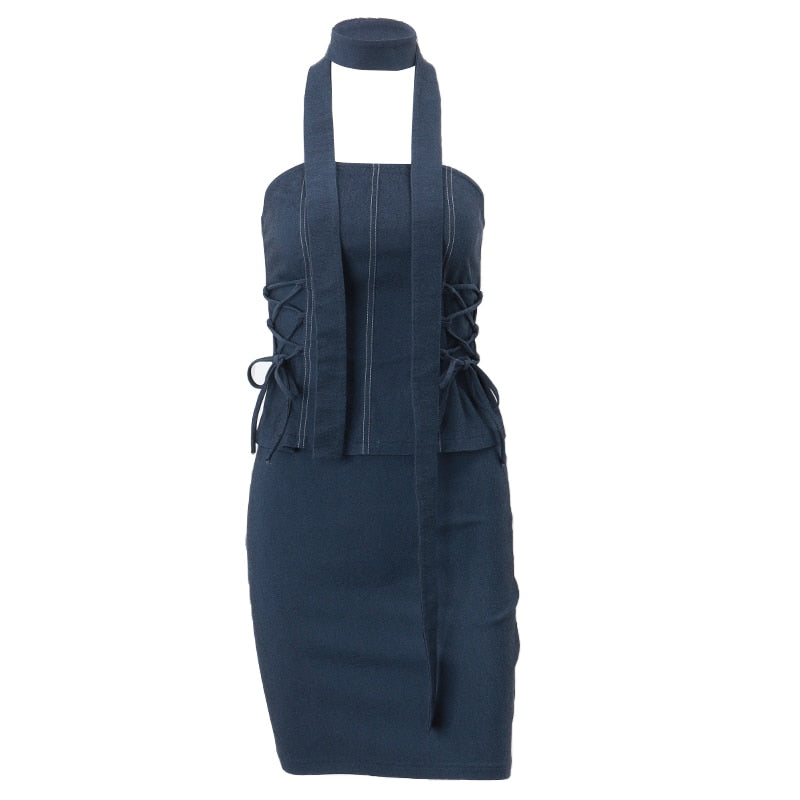 Women Formal Occasions Two Piece Set Sexy Side Cross Bandage Solid Tube Tank Top With Skinny Slim Skirt Summer New