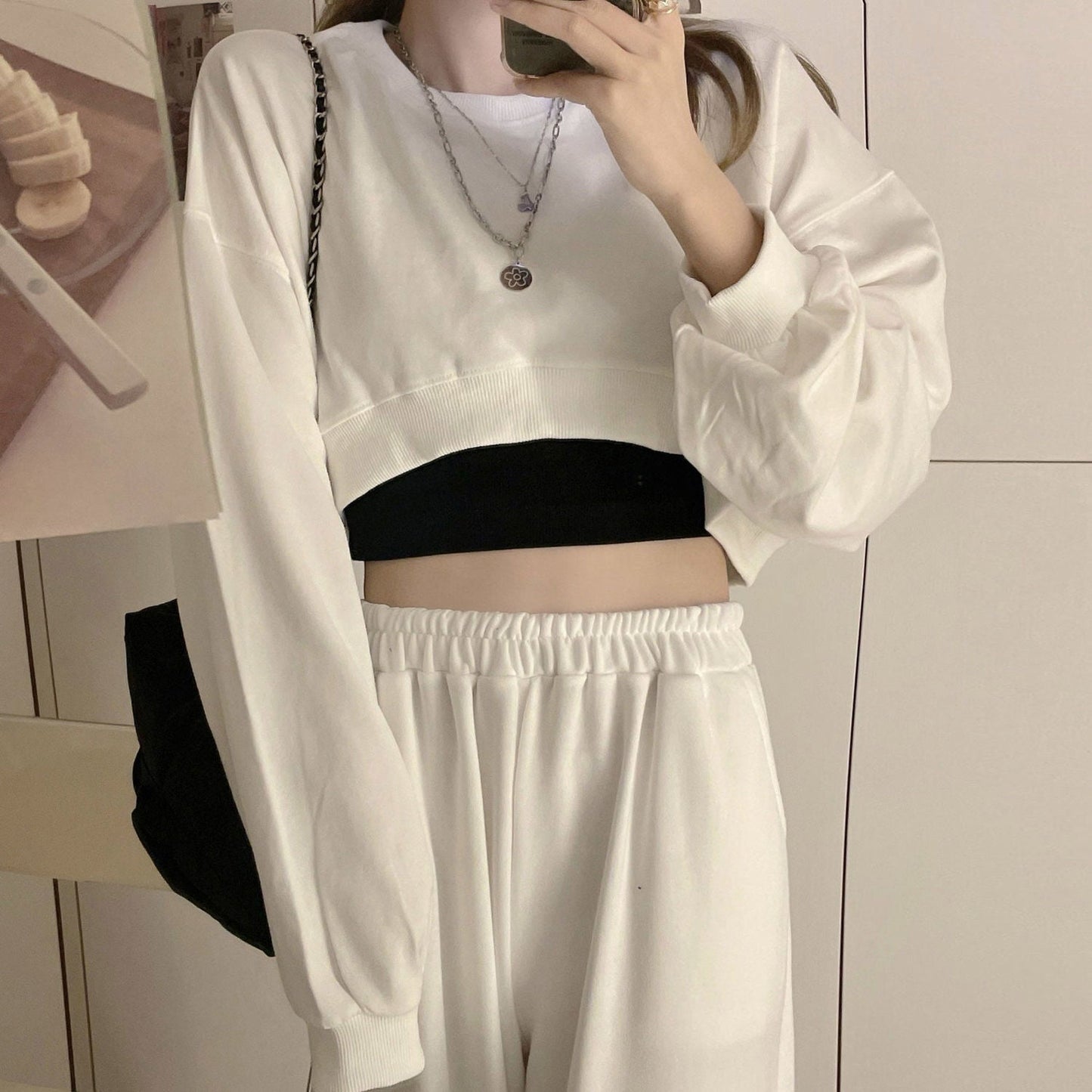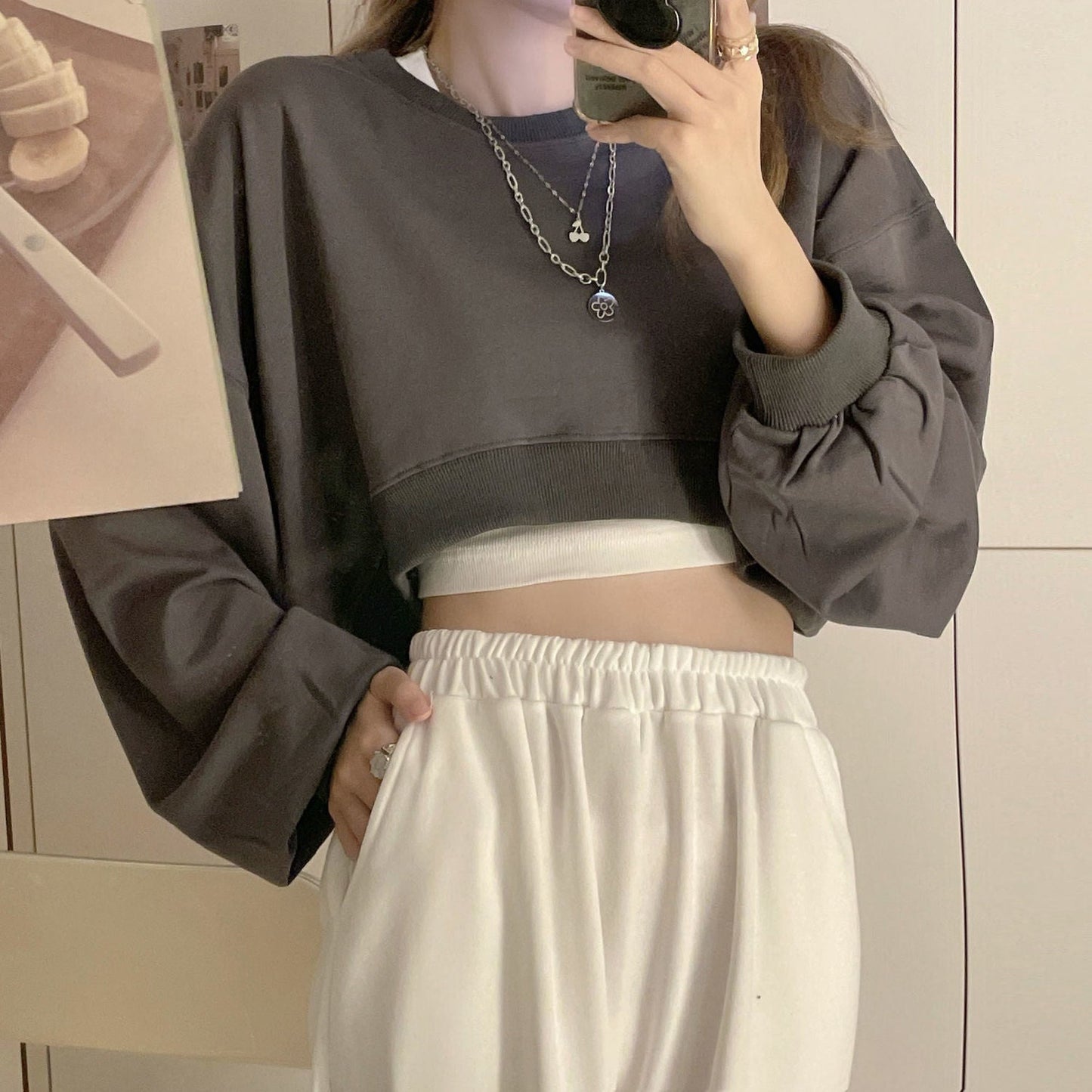 Women Pullover Solid Cropped Hoodies Long Sleeves Loose Sweatshirts Casual Crop Tops for Spring Autumn Winter Mujer