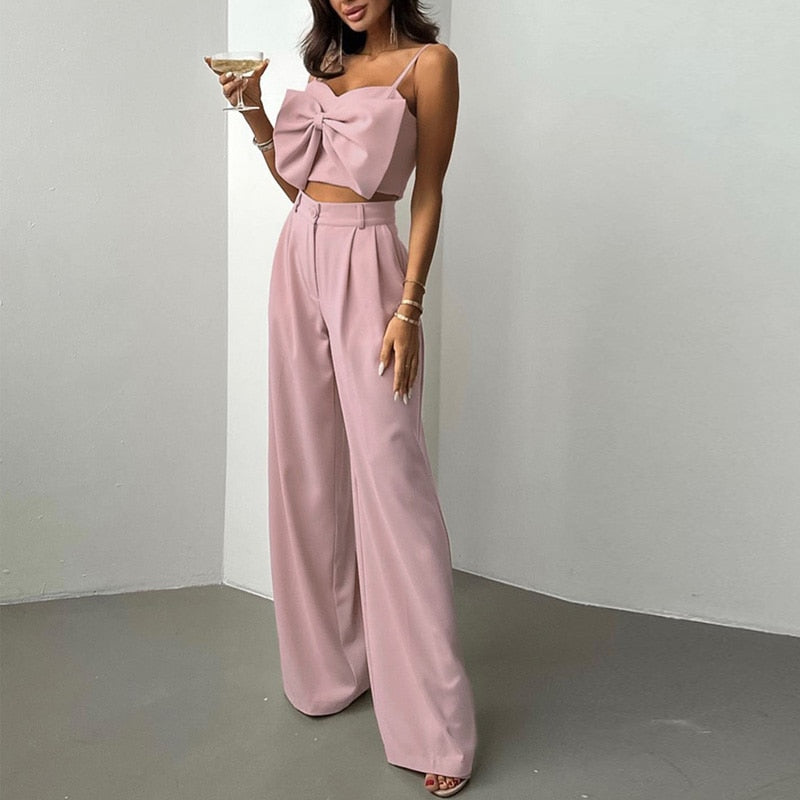 maoxiangshop Women Sexy Hollow Out Solid Sling Tank Suits Fashion Party Two Piece Set Elegant Bowknot Crop Top And Long Pants Commute Outfits