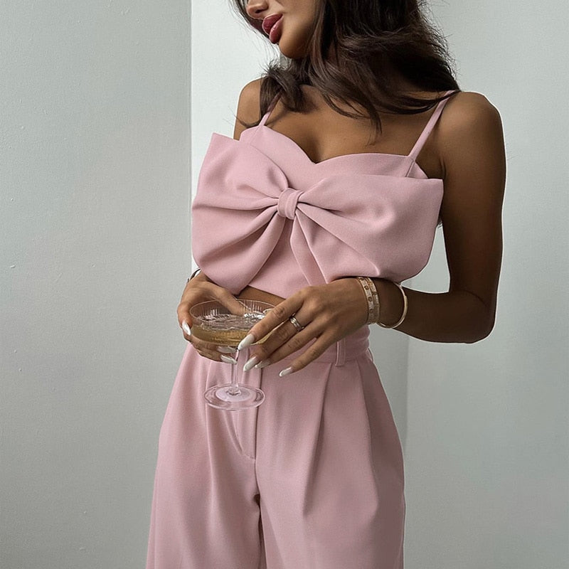 Women Sexy Hollow Out Solid Sling Tank Suits Fashion Party Two Piece Set Elegant Bowknot Crop Top And Long Pants Commute Outfits