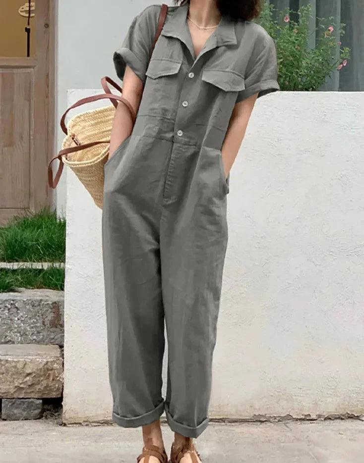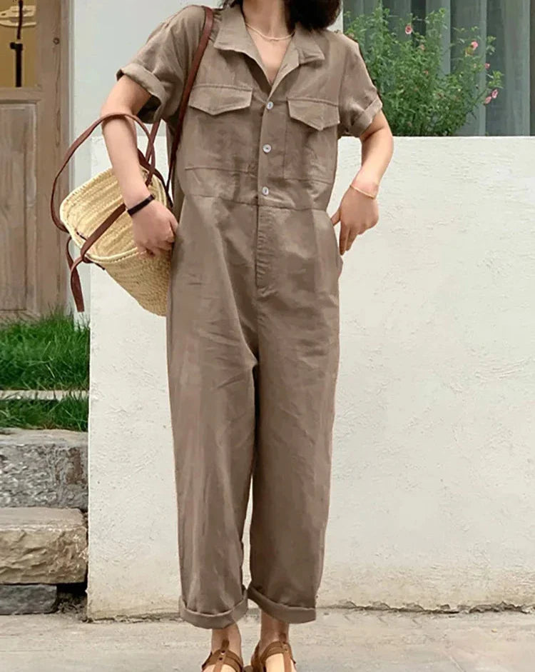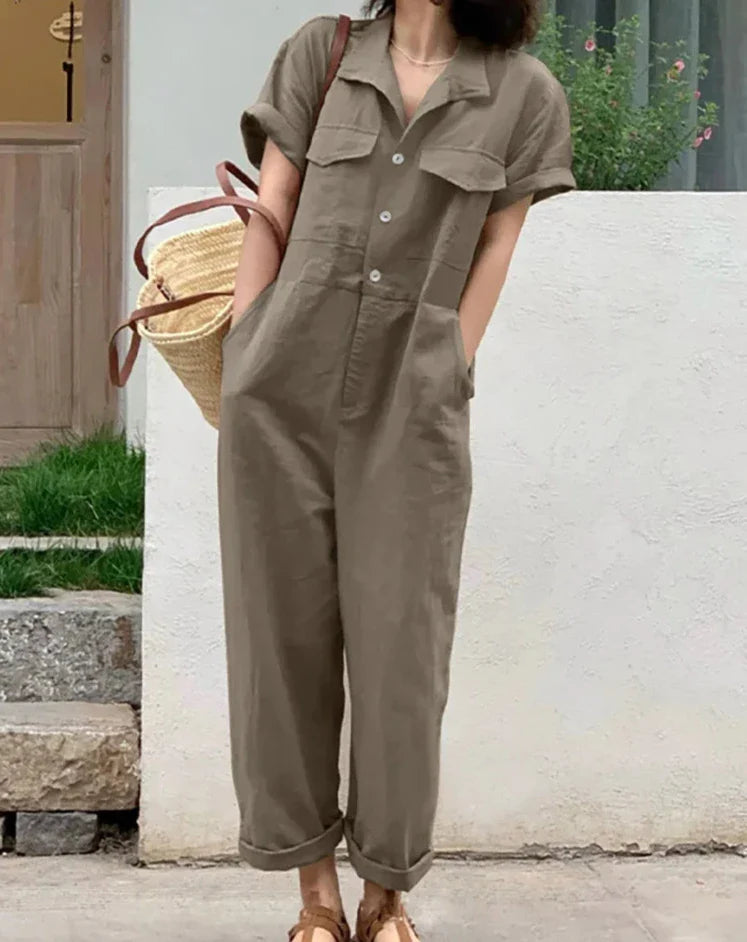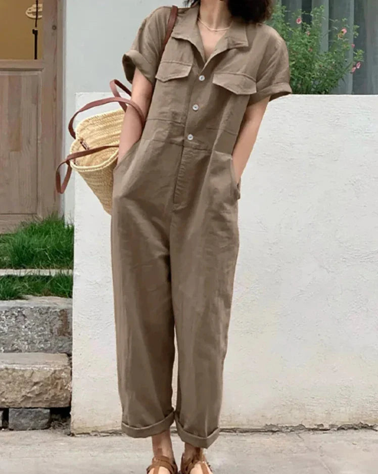 Women Summer Jumpsuit Lapel Solid Color Short Sleeved Dungarees Femme Fashion Causal Elegant Rompers Work OL Pant