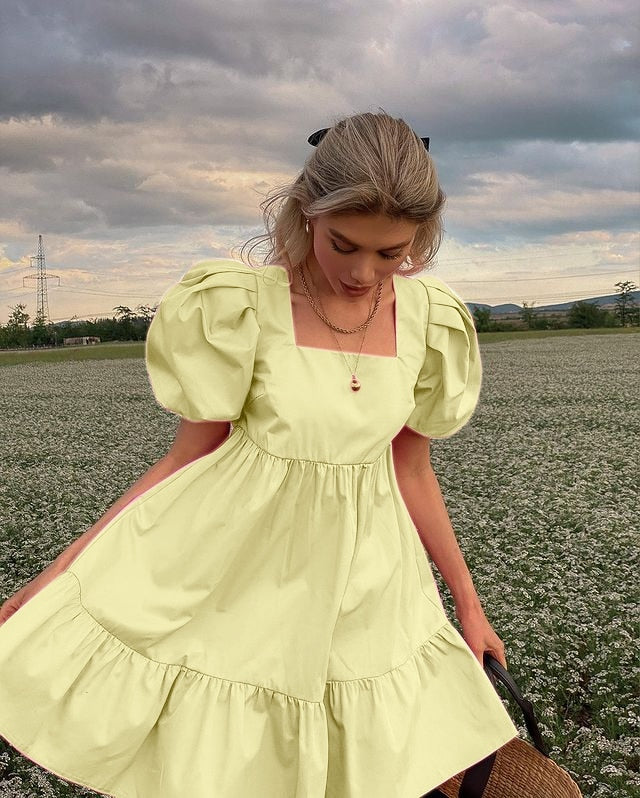 maoxiangshop Women's Off Shoulder Flounce Puffy Sleeve High Waist Ruffles Mini Dress Bohemian style Prom A-Line Dress