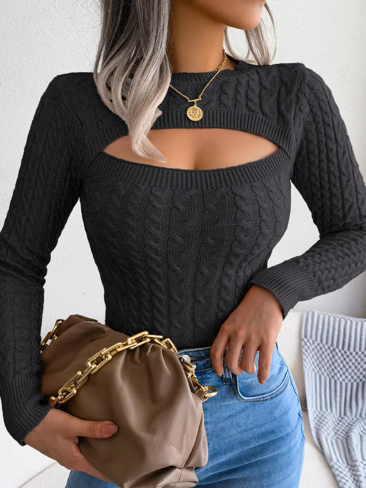 Women's Pullover Autumn Winter 2023 Sexy Elegant Hollow Long Sleeve Knitted Top Casual Vintage Crop O-neck Slim Fit Knit Sweater