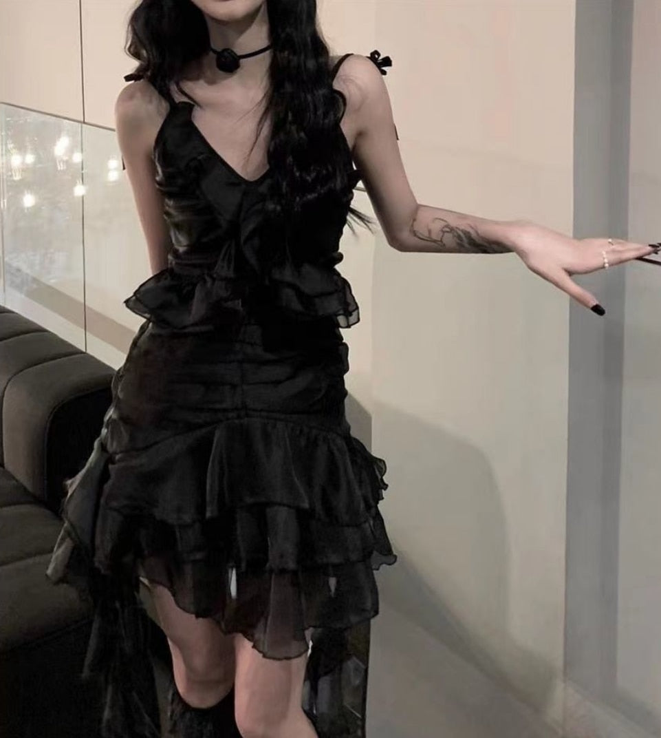maoxiangshop Y2K Mini Dress Summer Gothic Strap Ruffles Fairy Dress Women Sleeveless Irreular V-neck Cake Dress Emo Alt Vintage Goth