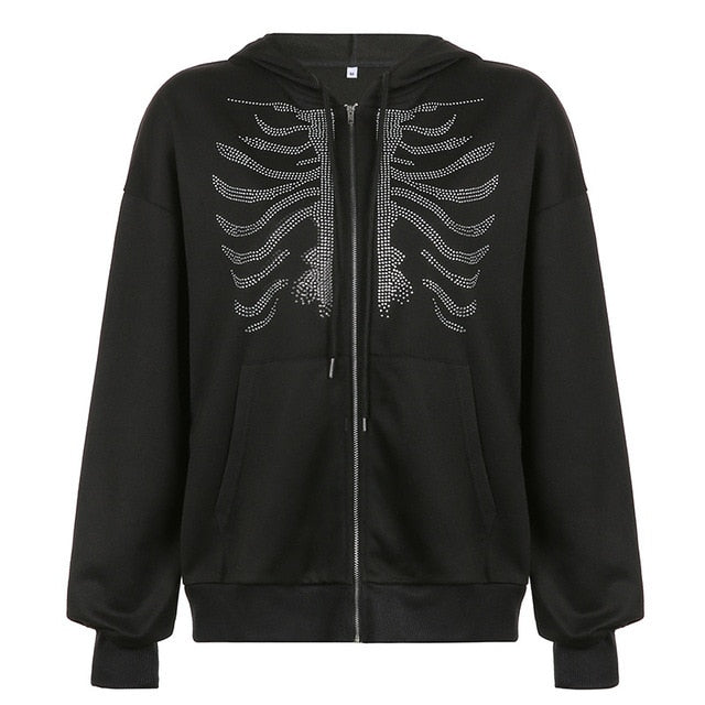 Y2K Rhinestone Skeleton Hoodies Women Autumn Streetwear Zip Up Goth Black Sweatshirts Harajuku Grunge Oversized Winter Hoodies