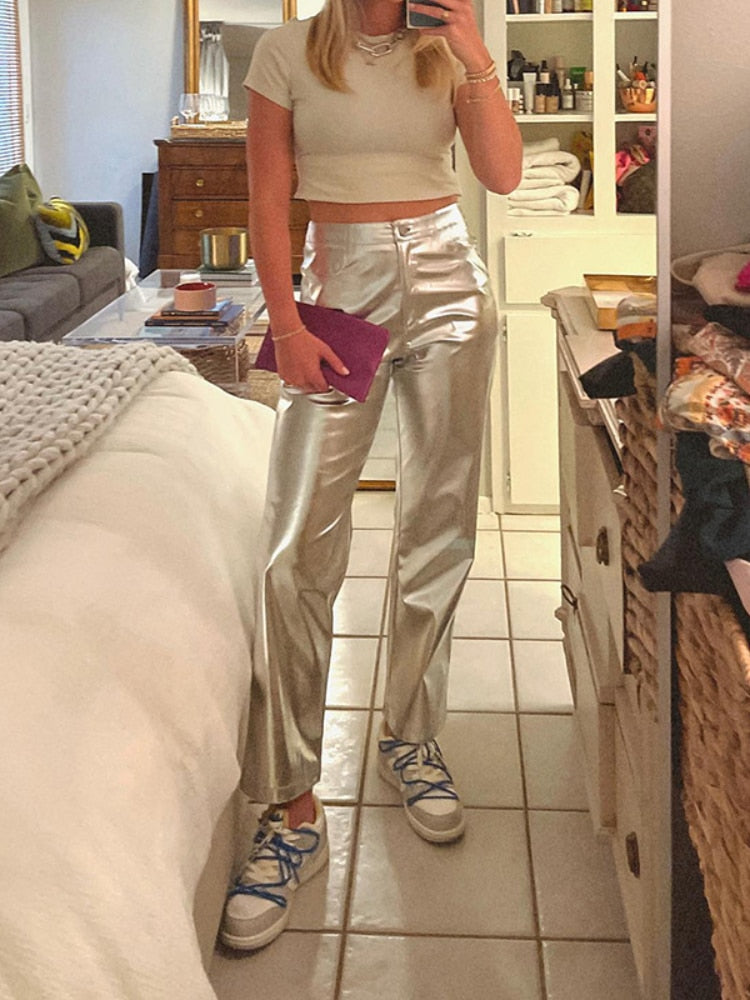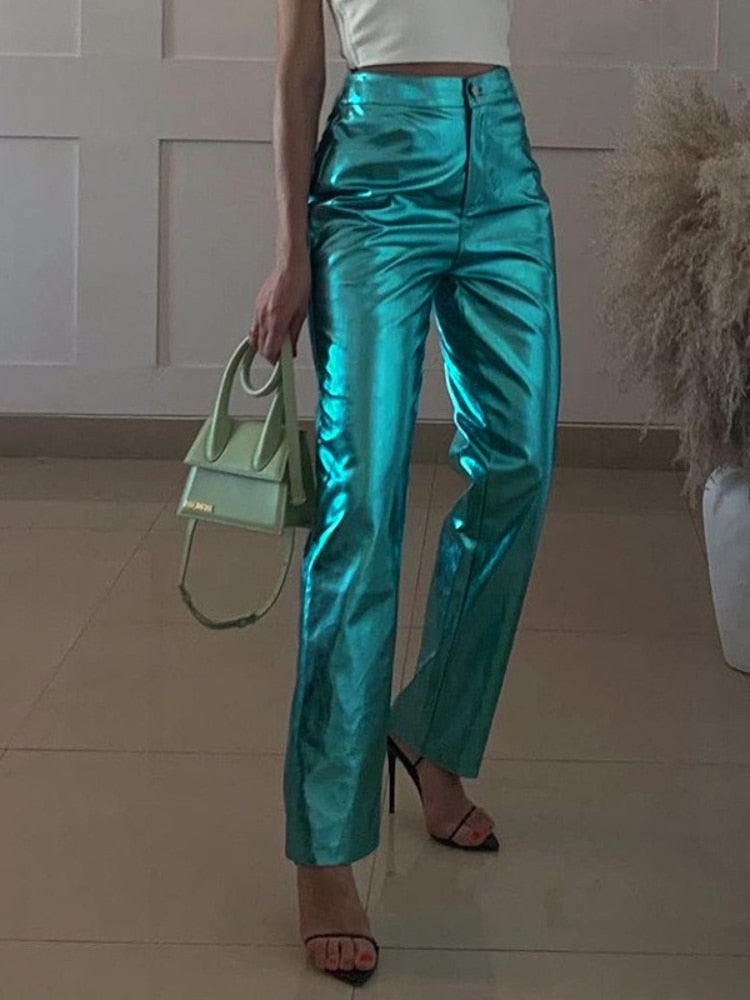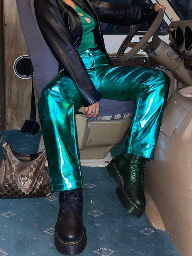 Y2K Shiny Metallic PU Leather Pants for Women Autumn Winter Green High Waist Straight Leg Pants Casual High Street Clubwear