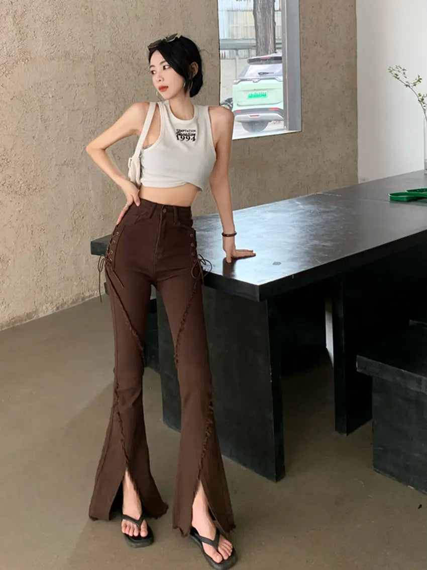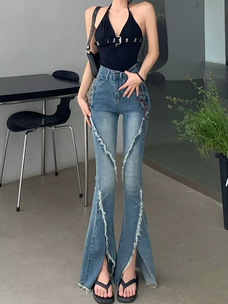 Y2k Slit Raw Edge Strappy Flared High Waist Jeans Retro High Street Fashion Wide Leg Pants Hot Girl Casual Simple Trousers