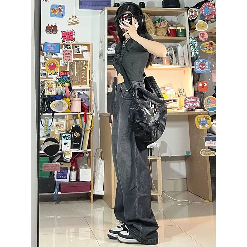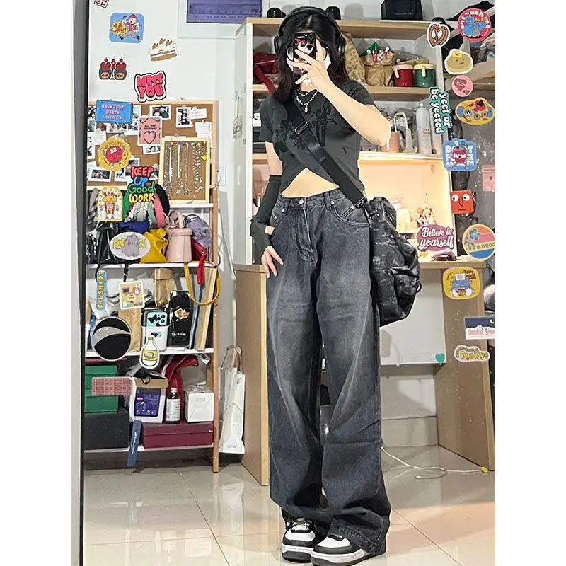 Y2k Straight Denim Trousers Jeans Women Vintage 90S High Waist Loose Wide Leg Casual Long Pants Clothing Female Streetwear